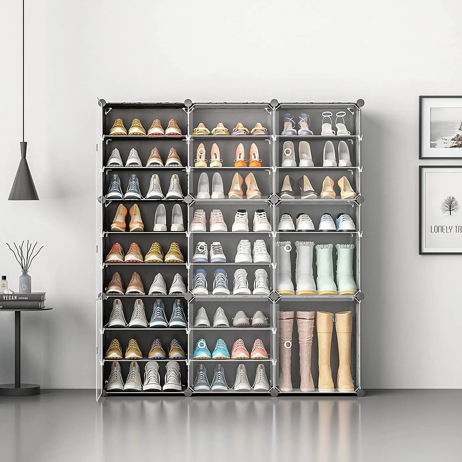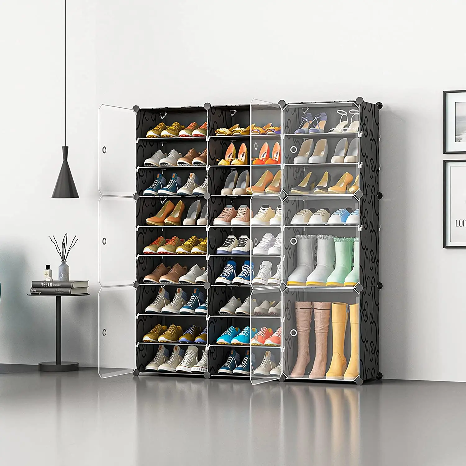 MULTI PURPOSE CABINET: each of the cubbies can store 2 pairs of shoes with a total capacity of 24-48 pairs of shoes; the modular closet can be used to store not only shoes but clothes, accessories, bedding and lining, CDs and DVDs, toys, cables.
